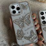 قاب موبایل ( آیفون – سامسونگ ) پروانه آموره نگین دار برجسته شاینی + بندست