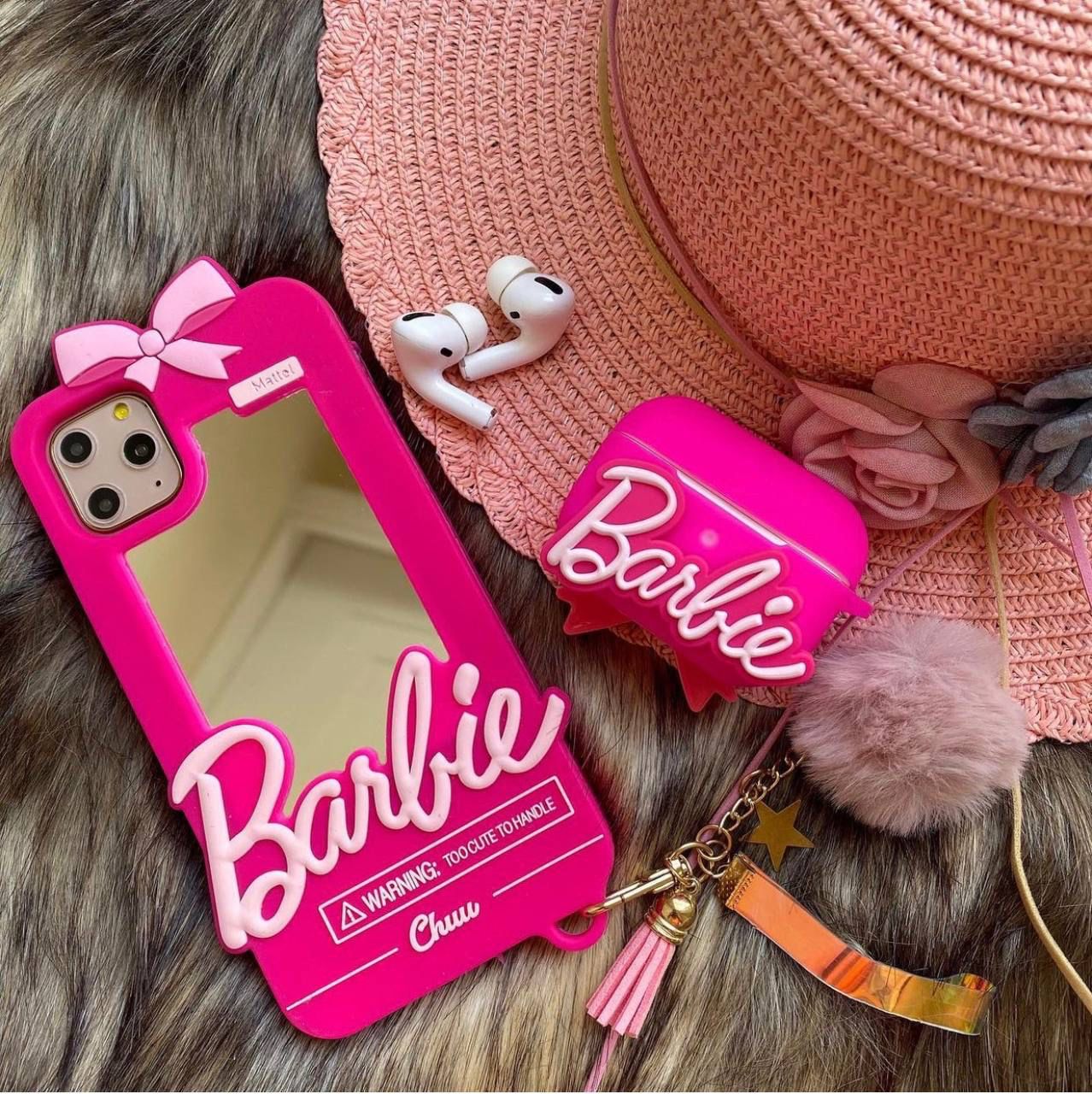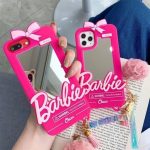 قاب موبایل آیفون باربی نوستالژی آیینه ای صورتی + آویز ست