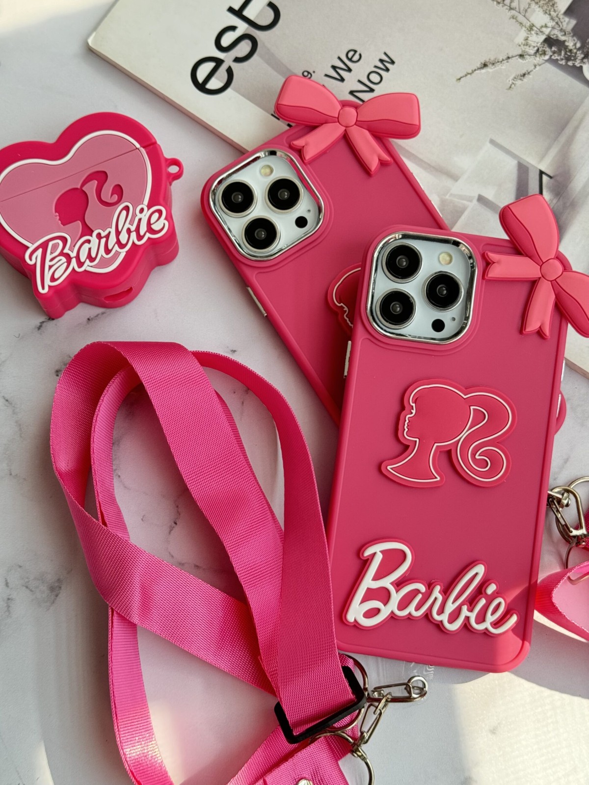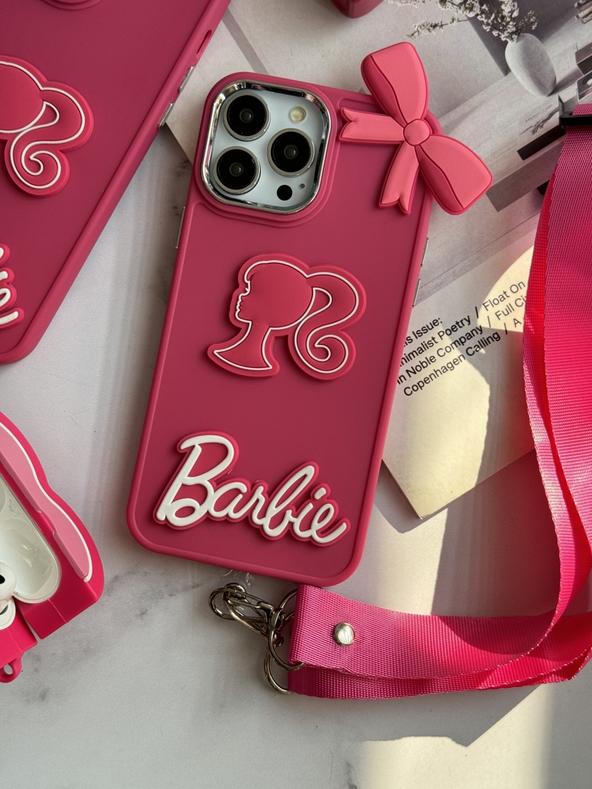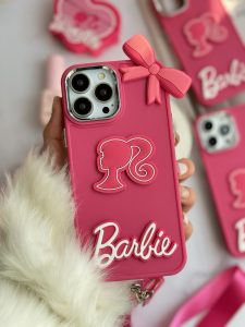 قاب موبایل آیفون باربی پاپیونی صورتی + بند بلند