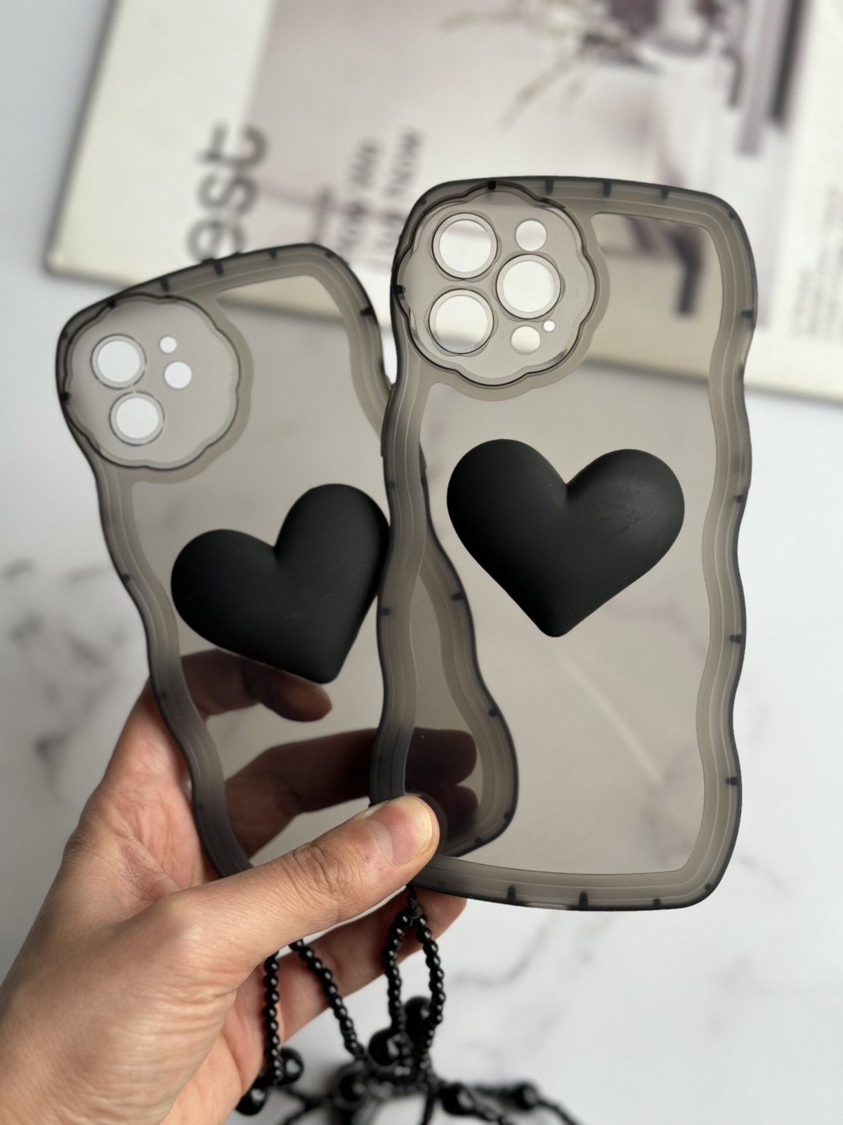 قاب موبایل آیفون تک قلب مشکی دودی + بندست قلبی ( 3004 )