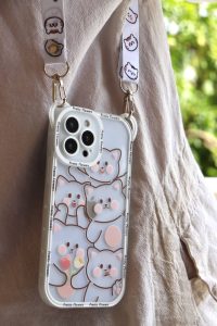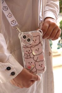 قاب موبایل آیفون خرس و پروانه نقاشی + بندست کوتاه