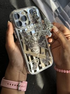 یکی از ویژگی‌های منحصربه‌فرد این قاب، وجود آویز فلزی پروانه‌ای و زنجیر مرواریدی است که علاوه بر زیبایی، امکان گرفتن راحت‌تر گوشی را فراهم می‌کند. آویزها از جنس فلز براق نقره‌ای ساخته شده‌اند و در برابر زنگ‌زدگی مقاوم هستند. این جزئیات خاص باعث شده‌اند این قاب میان اکسسوری‌های فانتزی جایگاه ویژه‌ای پیدا کند.