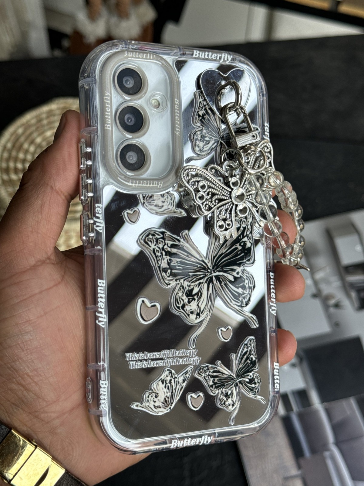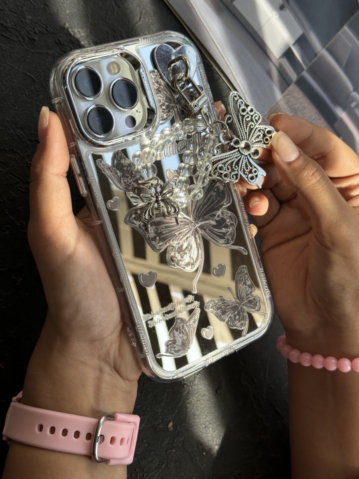 قاب موبایل آیفون سامسونگ پروانه و قلب آیینه ای آویز دار برای افرادی طراحی شده که عاشق استایل‌های فانتزی، لطیف و درخشان هستند. ترکیب پروانه‌ها با قلب‌های نقره‌ای، نمایی لطیف و جذاب ایجاد کرده که به‌راحتی با استایل روزمره یا حتی مجلسی هماهنگ می‌شود.