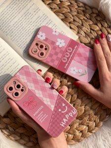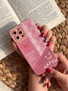 قاب موبایل آیفون سری لبخند صورتی چهارخونه محافظ لنزدار