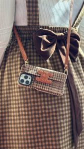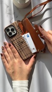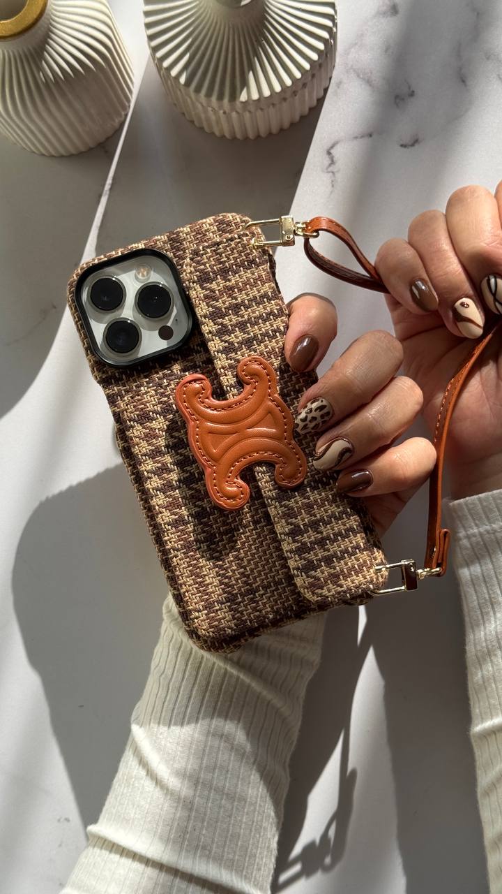 قاب موبایل ( آیفون ) سلین استریپ پارچه ای قهوه ای جاکارتی + بند بلند