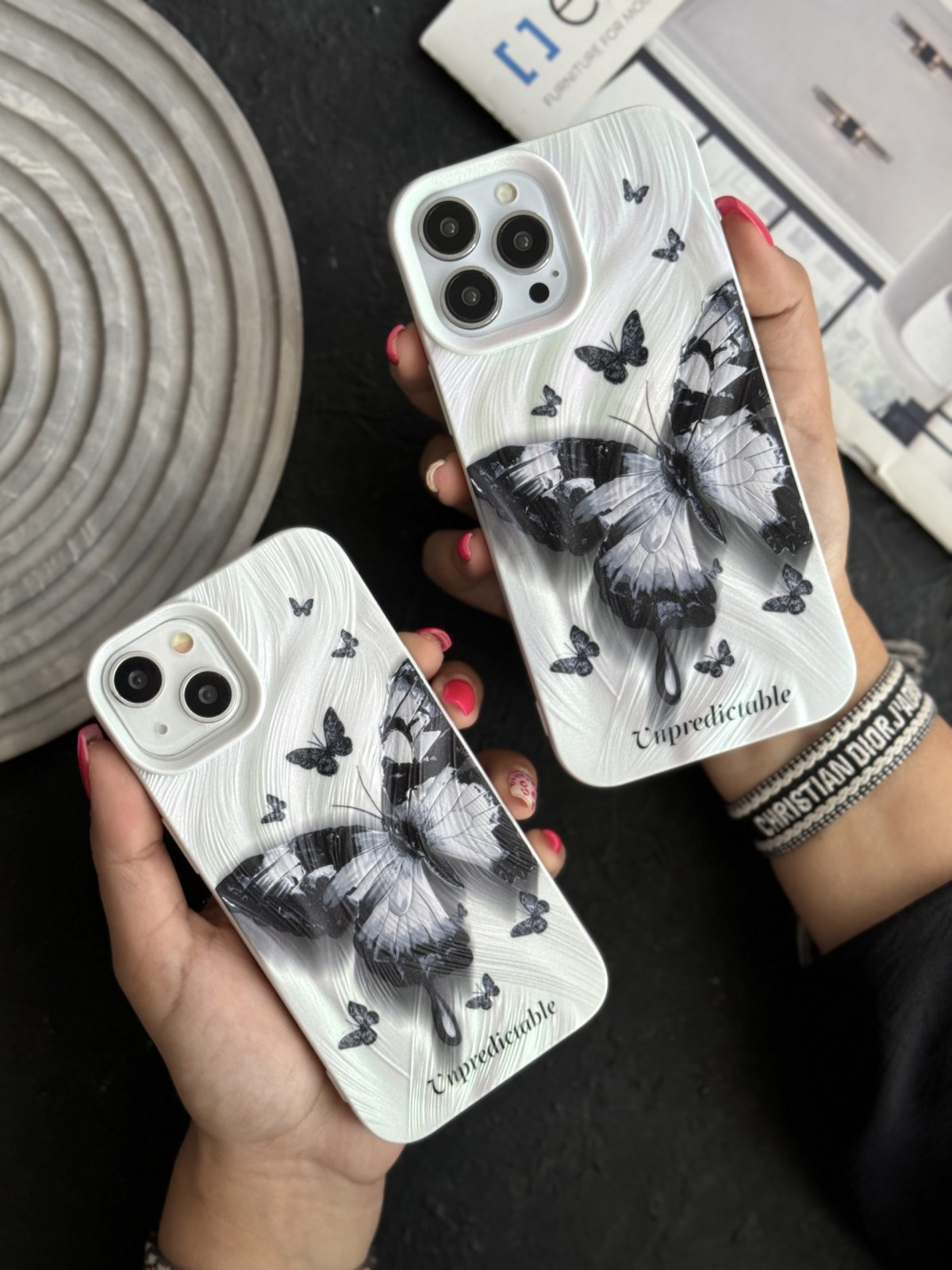 قاب موبایل آیفون دم روباهی پروانه گل سرخ + بندست پشمی