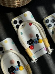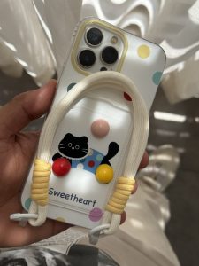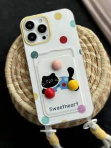 قاب موبایل آیفون گربه خوش قلب توپی جاکارتی بنددار