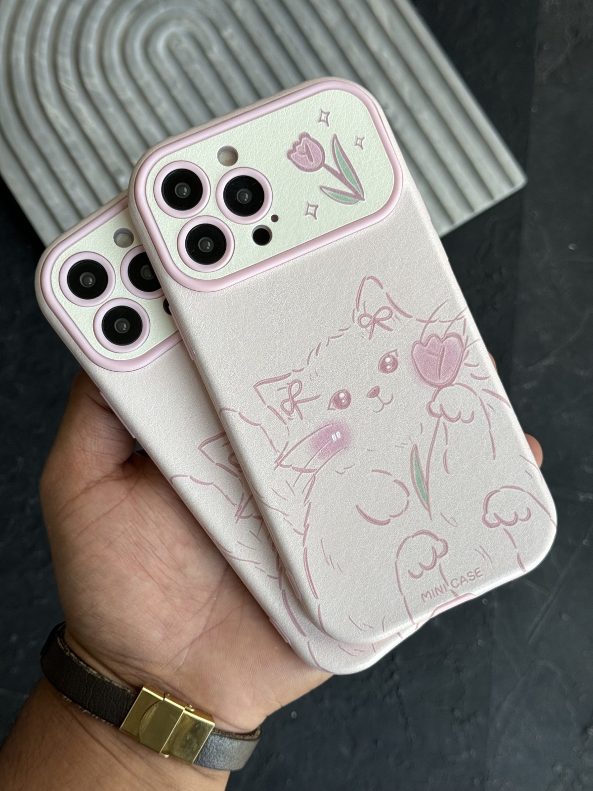 قاب موبایل آیفون گل فلاور کرم فندقی + بند چرمی ست