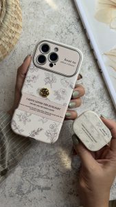 قاب موبایل آیفون گل فلاور کرم فندقی + بند چرمی ست
