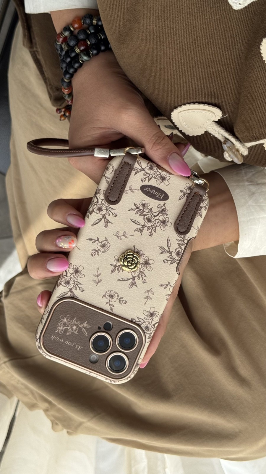 قاب موبایل ( آیفون ) گل رز فلورا قهوه ای + بندست چرمی
