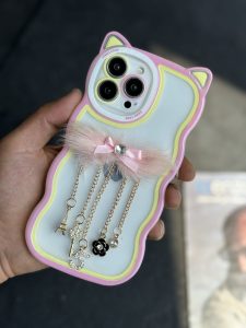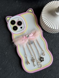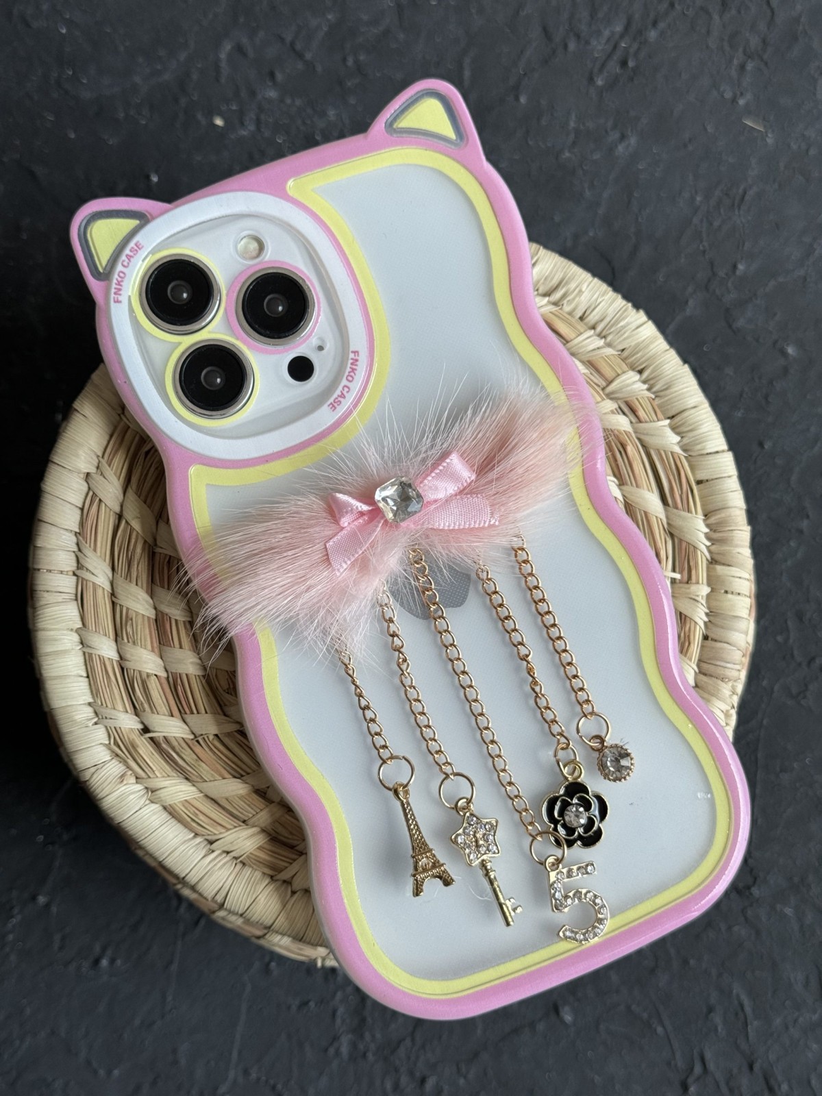 قاب موبایل آیفون دم روباهی پروانه گل سرخ + بندست پشمی