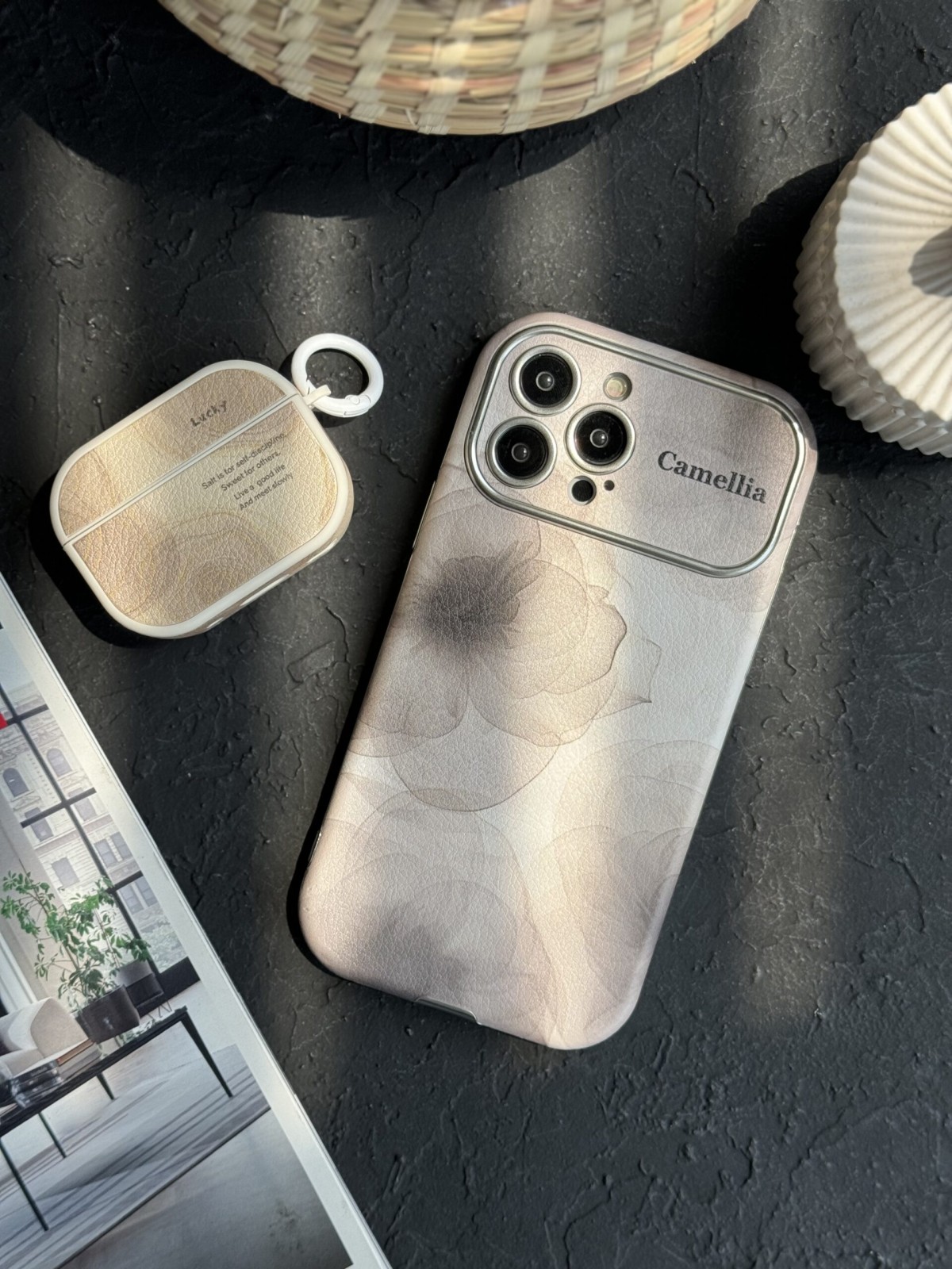 قاب موبایل آیفون گل فلاور کرم فندقی + بند چرمی ست
